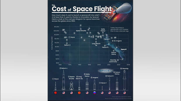 Чем выше отметка, тем дороже стоимость подъёма килограмма груза на орбиту. Составители инфографики делают вид, что не знают о существовании современных "Союзов", но тенденция раскрыта вполне наглядно.